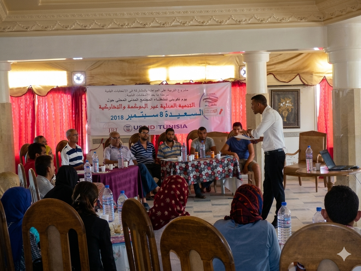 • ظمت جمعية الحلول ذكية للتخطيط التنموي و التوازن الاجتماعي بالتعاون مع جمعية الوطن للتنمية بالسعيدة يوم تكويني للناشطين في المجتمع المدني بمعتمدية السعيدة يوم 8/9/2018 ضمن مشروع ‘التربية على المواطنة بالمشاركة في الانتخبات البلدية : مرحلة بعد الانتخبات و يحتوي البرنامج الدورة على حصة نظرية حول الحوكمة و التشاركية.