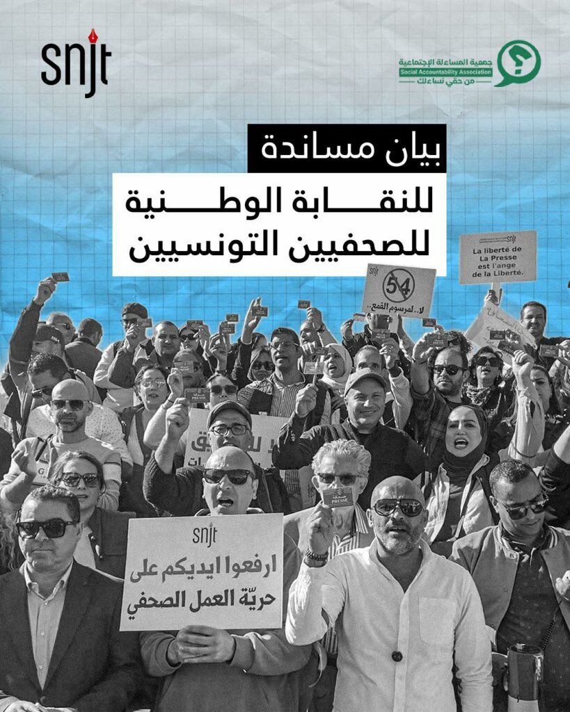 تعبّر جمعية المساءلة الاجتماعية عن تضامنها المطلق مع التحرّك الوطني الذي دعت إليه النقابة الوطنية للصحفيين التونسيين بساحة القصبة وأمام مقرات مختلف الولايات، وعن دعمها لنضالات قطاع الصحافة في مواجهة التحديات اليومية في ظل الواقع الاجتماعي والاقتصادي المتردّي وتضييقات السلطة السياسية القائمة.
